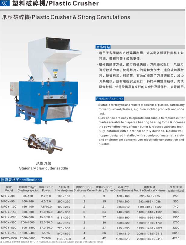 適用于各種逆料之粉碎再利用,尤其對各類硬性塑料(如料頭,鞋楦料等)效果更佳。NPCY系列破碎機操作方便,換刀簡便快捷;刀架優(yōu)化設計,爪型刀可分散受力度,便得每片刀和剪切力加大,適合破碎厚材料,硬質料塊,料頭等,有效的提高了刀具切削力,減少刀具磨損;設有電控按全設計,料頭采用雙層結構,內填隔音材料,使得設備具有良好的安全性及環(huán)保性,省電耐用。