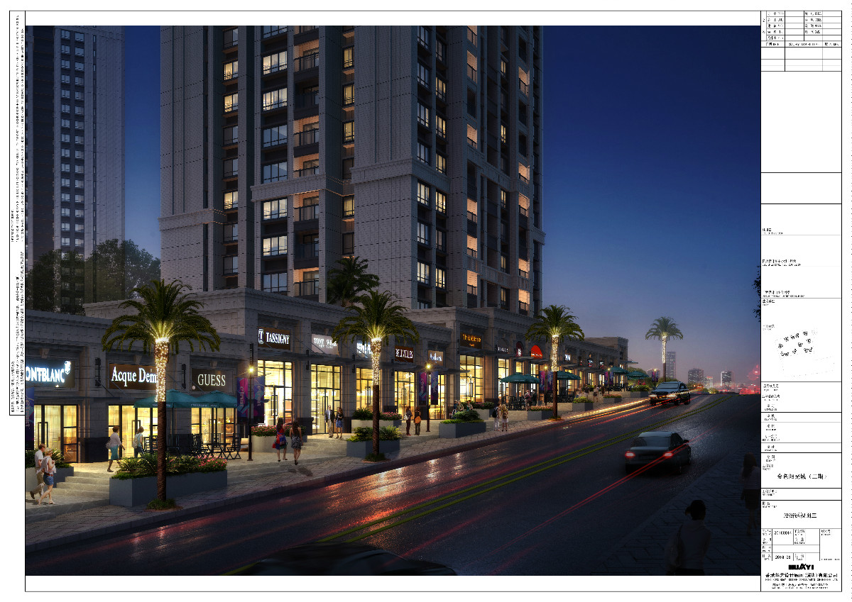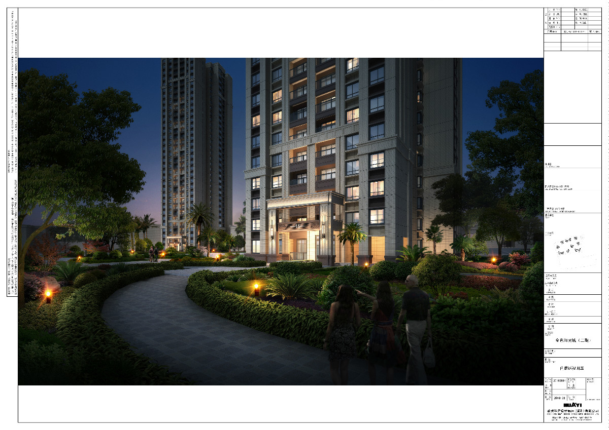 整個(gè)地塊西高東低,北高南低,西北角最高,采用從西向東坡度為1.79%的大斜板方式找平地面,二期規(guī)劃有10棟高層13個(gè)單元,全部沿地塊周邊(街邊)布局,退道路紅線15米,中間留出較大中庭,景觀視野開(kāi)闊,西面和北面的建筑沿街1樓結(jié)合地形的高差做成了1-2層的底商。