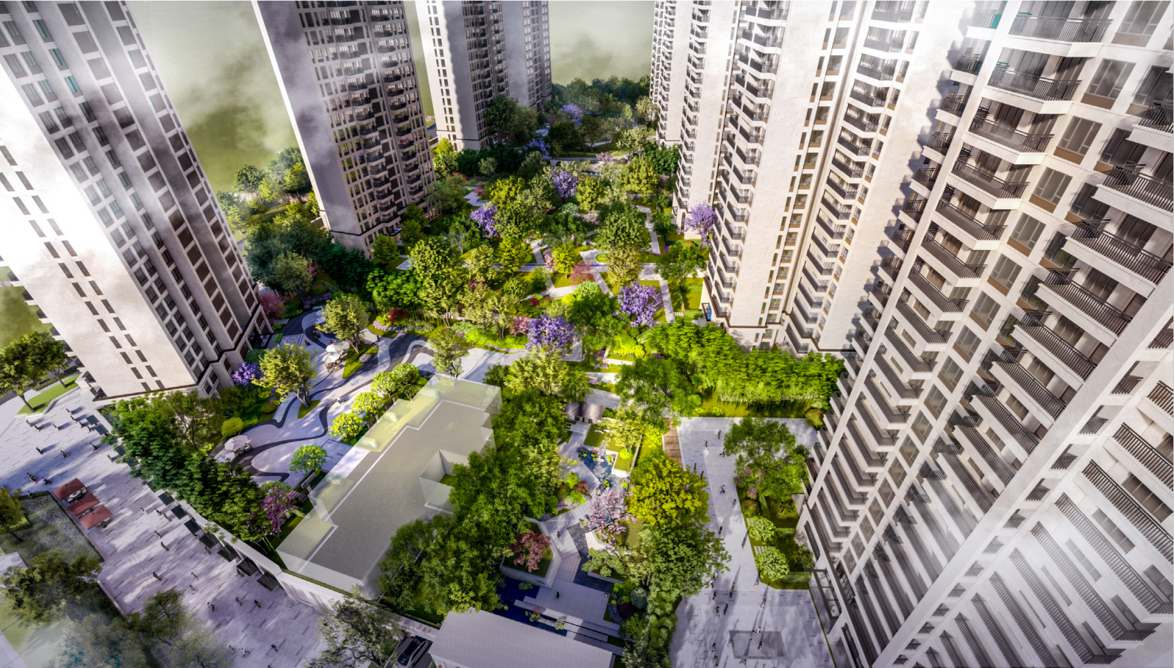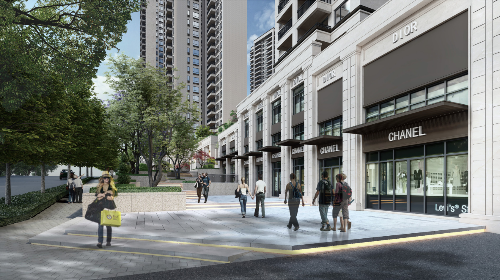 建筑設(shè)計(jì):建筑風(fēng)格為的新亞洲風(fēng)格。色系為暖黃色系,金屬質(zhì)感,咖色作為重色,提升質(zhì)感并點(diǎn)綴?,F(xiàn)代簡約的建筑線條,樓高依勢自西向東分為97.85m, 94.85m, 93.85m, 89.85m, 87.85m。形成自西向東的天際線。