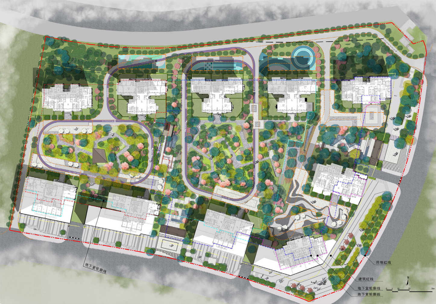 景觀設(shè)計(jì):園林景觀方面,根據(jù)地形地勢特點(diǎn),打造了極具特色的臺(tái)地景觀。園林方面設(shè)計(jì)了一軸、兩環(huán)、三重景